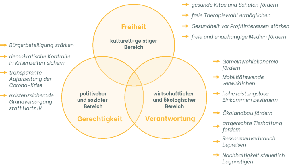 Das erste Grundprinzip Freiheit, bezieht sich besonders auf die Corona-Krise. Die Einschränkungen von Grundrechten, wie z.B. das Demonstrationsrecht, die Pressefreiheit oder das Recht auf freie Meinungsäußerung dürfe von der Politik nicht hingenommen werden. „Die Politik hat im Falle einer Krise lediglich für eine vollständige öffentliche Aufklärung der möglichen Risiken zu sorgen“, heißt es in ihrem Programm. Des Weiteren werden eine sofortige Untersuchung und Aufarbeitung, der Hinter- und Beweggründe des staatlichen Handels in der Corona-Krise gefordert. Auch die Impflicht ist für die Partei „rein persönlich und darf auf keinen Fall staatlich vorgeschrieben werden“, deshalb wird auch die Rücknahme des Masernschutzgesetzes verlangt. Die Freiheit bezieht sich aber auch unter anderem auf Bildungseinrichtungen, welche frei, eigenständig und selbstverwaltend organisiert sein sollten.